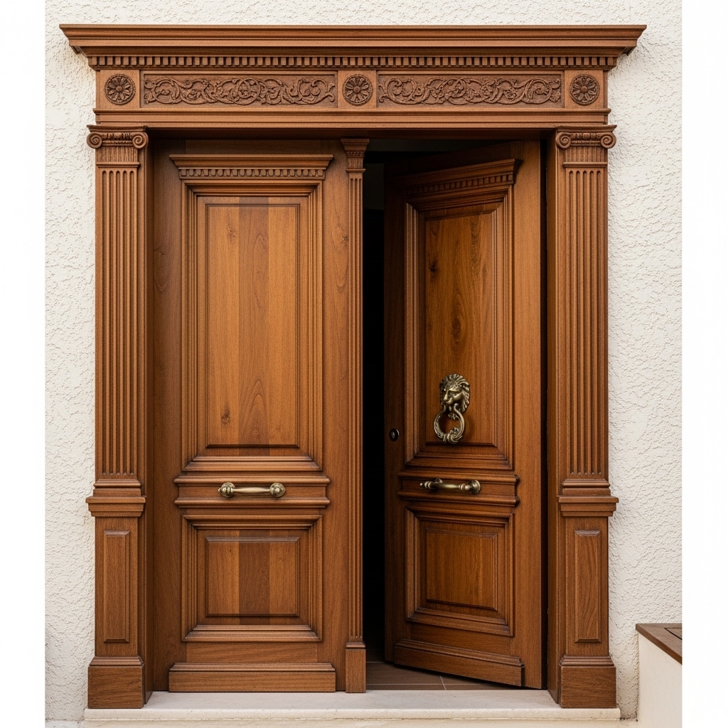 Os entalhes decorativos, molduras profundas e colunas laterais reforçam a estética neoclássica, conferindo imponência e riqueza visual. O acabamento manual valoriza os veios naturais da madeira, garantindo exclusividade e durabilidade.