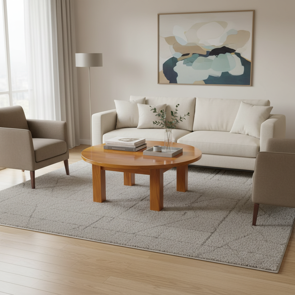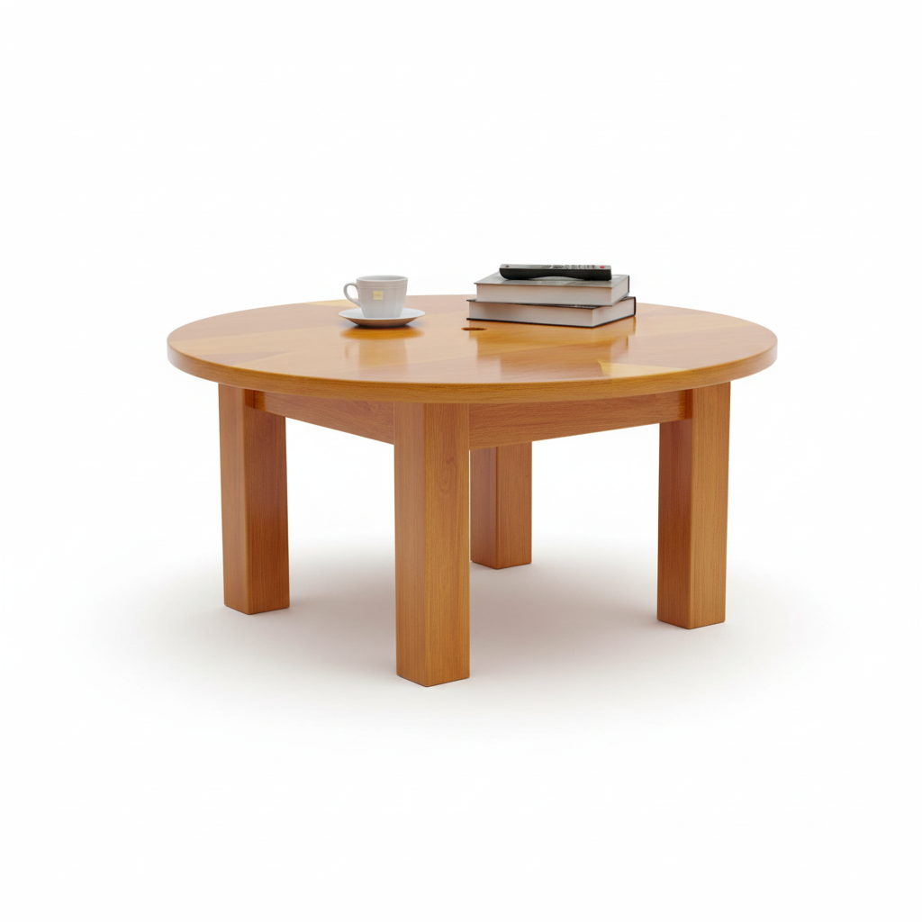 Mesa de centro em madeira maciça, com tampo circular e base composta por pés retos e robustos, criando uma leitura sólida e elegante.