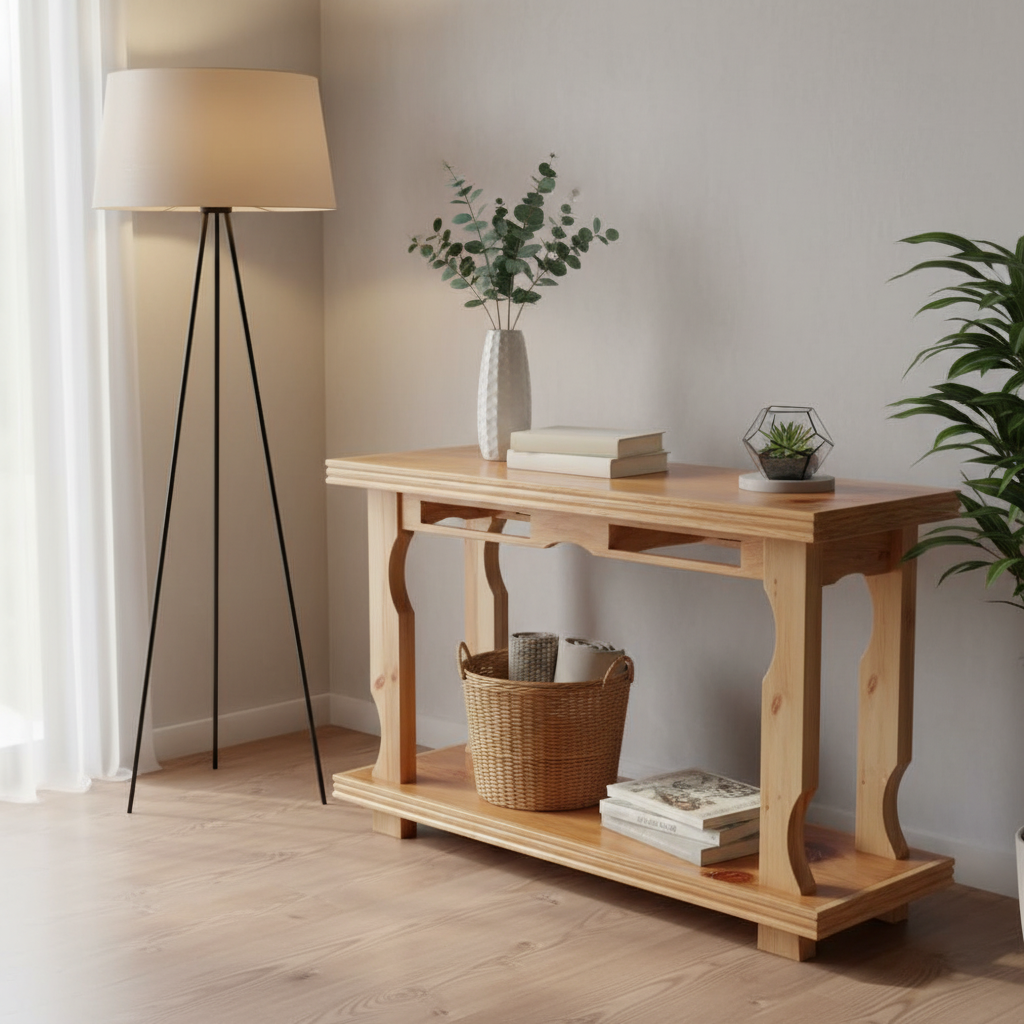 Estrutura em madeira natural com acabamento artesanal, linhas clássicas suavizadas, pés curvos de inspiração tradicional e prateleira inferior funcional. Design versátil, proporções harmônicas e presença acolhedora para ambientes refinados.